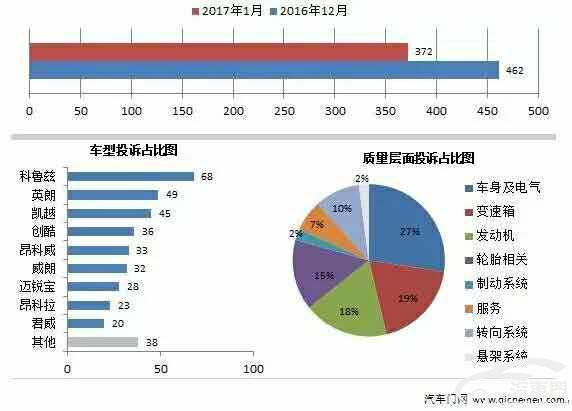 汽車質量投訴點評:2017年1月份累計收到上汽通用旗下三大品牌質量投訴372宗,較上月投訴環(huán)比下滑19.5%。車身及電氣質量相關投訴占比最大達到27%,其次是變速箱和發(fā)動機質量問題相關,分別占比19%和18%。
