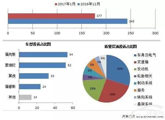 汽車投訴點評:2017年1月份累計收到長安福特旗下產品質量投訴177宗,較上月投訴環(huán)比下滑27%。其中,車身及電氣質量相關投訴占比最大,達到30%,其次是變速箱和發(fā)動機質量問題相關,分別占比26%和18%。