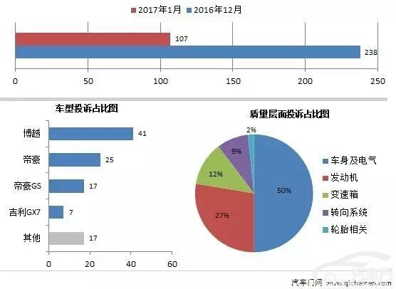 汽車投訴點評:2017年1月份累計收到吉利汽車旗下產品質量投訴107宗,較上月投訴環(huán)比下滑55%。其中,車身及電氣質量問題相關投訴占比達到一半,其次是核心部件發(fā)動機和變速箱質量問題相關,分別占比27%和12%。