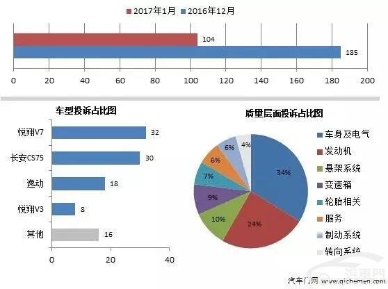 汽車投訴點評:2017年1月份累計收到長安汽車旗下產品質量投訴104宗,較上月投訴環(huán)比下滑78%,其中,車身及電氣質量問題相關投訴占比最大,約34%;其次是核心部件發(fā)動機質量問題相關,占比約24%。