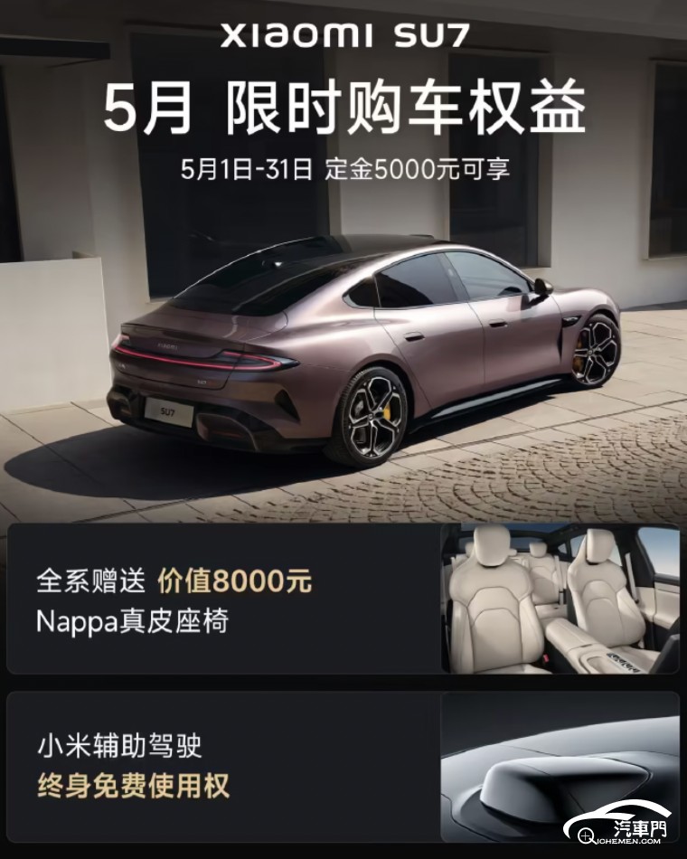 相比其他的車(chē)企真金白銀的降價(jià),小米汽車(chē)的優(yōu)惠政策比較隱晦。小米汽車(chē)官方宣布,五一期間下定SU7即送價(jià)值8000元的Nappa真皮座椅和終身免費(fèi)輔助駕駛。