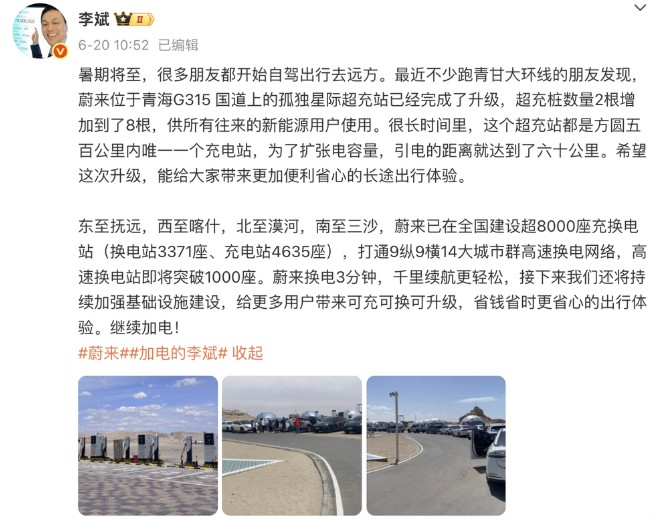 日前,蔚來創(chuàng)始人、董事長、CEO李斌發(fā)文稱,東至撫遠(yuǎn),西至喀什,北至漠河,南至三沙,蔚來已在全國建設(shè)超8000座充換電站(換電站3371座、充電站4635座),打通9縱9橫14大城市群高速換電網(wǎng)絡(luò),高速換電站即將突破1000座。