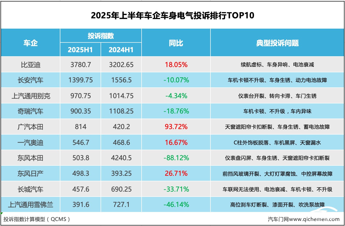 2025年上半年車企車身電氣投訴指數(shù)排行:車機(jī)和電池問題顯現(xiàn)