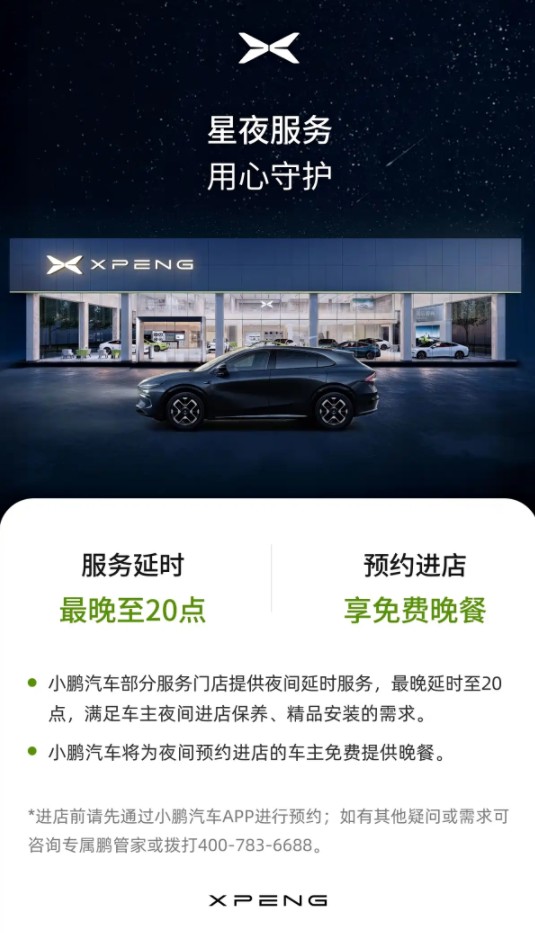 日前,小鵬汽車推出“星夜服務(wù)”,宣布部分門店的服務(wù)時(shí)間將延長(zhǎng)到20:00,同時(shí)還給用戶提供免費(fèi)晚餐。值得注意的是,該服務(wù)需要提前在小鵬汽車APP進(jìn)行預(yù)約,預(yù)約成功后方可到店。