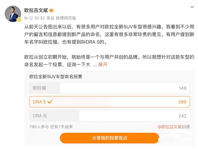 截至發(fā)文,共有790人參與歐拉全新SUV車型命名投票,其中票數(shù)最高的是“ORA 5”,有399人選擇;人氣最低的是“歐拉貓”,票數(shù)為149。