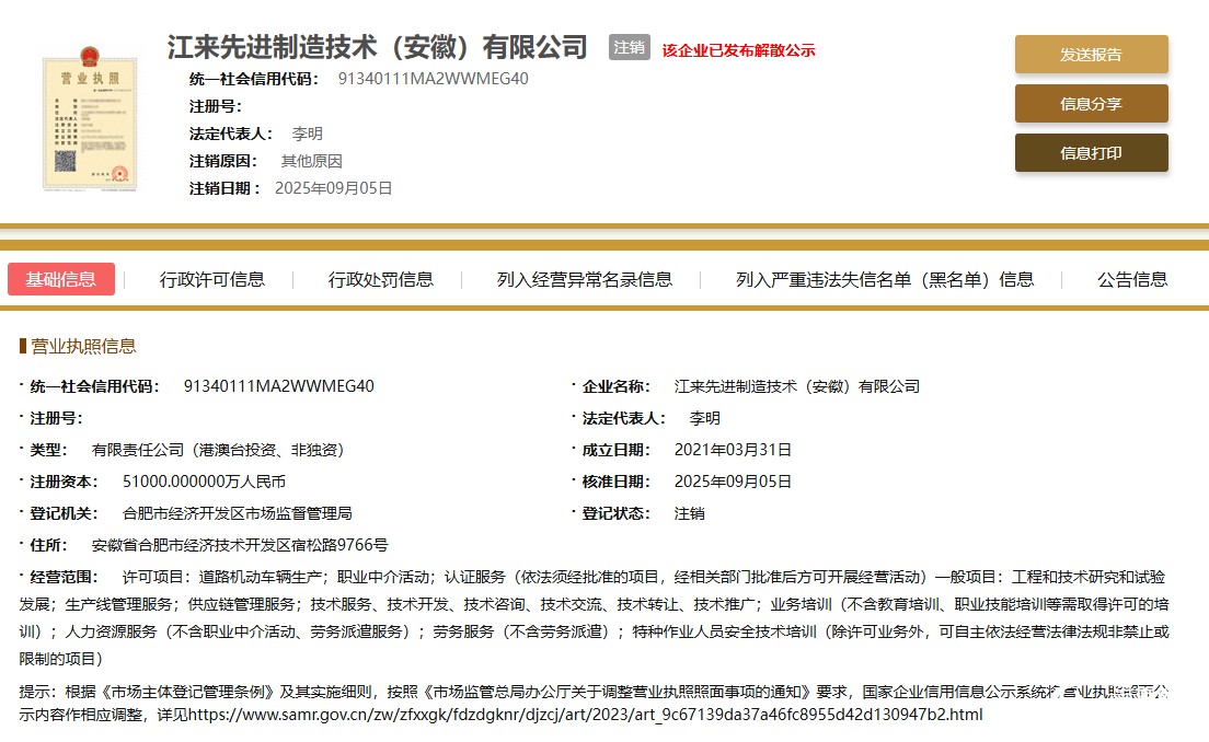 近日,國家企業(yè)信用信息公示系統(tǒng)顯示,江來先進(jìn)制造技術(shù)(安徽)有限公司的企業(yè)狀態(tài)已由“存續(xù)”變更為“注銷”,標(biāo)志著這家由蔚來與江淮汽車共同設(shè)立的合資公司正式終止運(yùn)營。