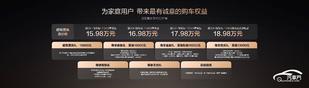 此次,唐DM-i智駕版 175KM長(zhǎng)續(xù)航版共推出3款車(chē)型,售價(jià)17.98萬(wàn)~19.98萬(wàn)元(10月31日前完成購(gòu)車(chē)可享10000元置換補(bǔ)貼)。同時(shí),比亞迪還為用戶(hù)準(zhǔn)備了包含置換補(bǔ)貼在內(nèi)的至高價(jià)值4.3萬(wàn)元盛唐禮遇。