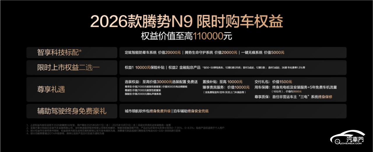為回饋廣大用戶的支持與信賴,2026款騰勢N9特別推出限時購車權益:10月31日(含)前提車的用戶,全系可享10000元保險補貼或金融貼息(二選一),置換補貼至高10000元。此外,還有價值45000元的智享科技,以及輔助駕駛終身免費豪禮。根據不同款型,限時贈送極致性能套裝、電動側踏板、隱私聲盾等科技豪華配置。智能電動門、吸頂屏套裝、流媒體外后視鏡以及雙色車身均享限時選裝價格,讓豪華觸手可及。詳情敬請咨詢騰勢直營店及當地經銷商。