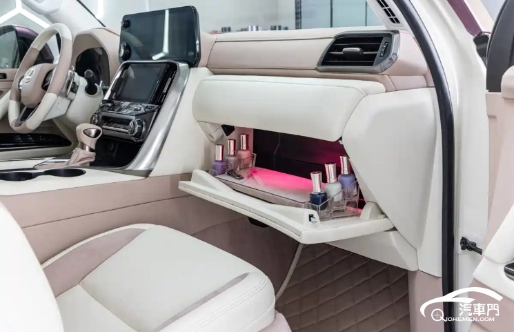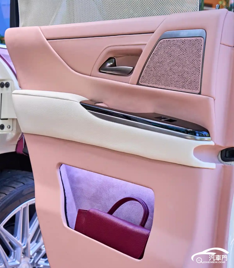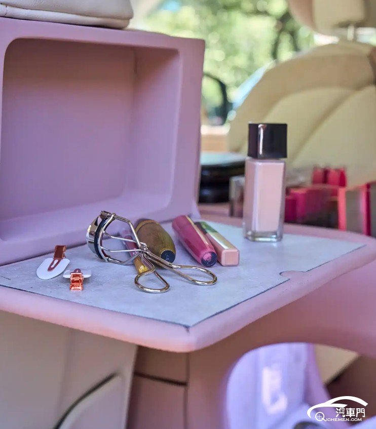 新車內(nèi)飾同樣車內(nèi)白色與粉色皮革搭配,與外觀相呼應(yīng)。同時(shí),車輛采用四座布局,二排過(guò)道區(qū)域下方配備吹風(fēng)機(jī)以及卷發(fā)棒收納槽,中央扶手區(qū)域?yàn)楦鞣N美妝物品的收納而設(shè)計(jì)。此外,車門下方的儲(chǔ)物槽也專為女生放包而設(shè)計(jì),并配備氛圍燈。值得一提的是,車輛后備廂將重新設(shè)計(jì)成為全新的衣帽間,有不同尺寸的抽屜以及衣架和鞋柜等等。對(duì)開(kāi)門的尾門也內(nèi)置了兩面鏡子。同時(shí),車輛仍將采用12.3英寸中控屏+12.3英寸液晶儀表+7英寸空調(diào)控制屏。