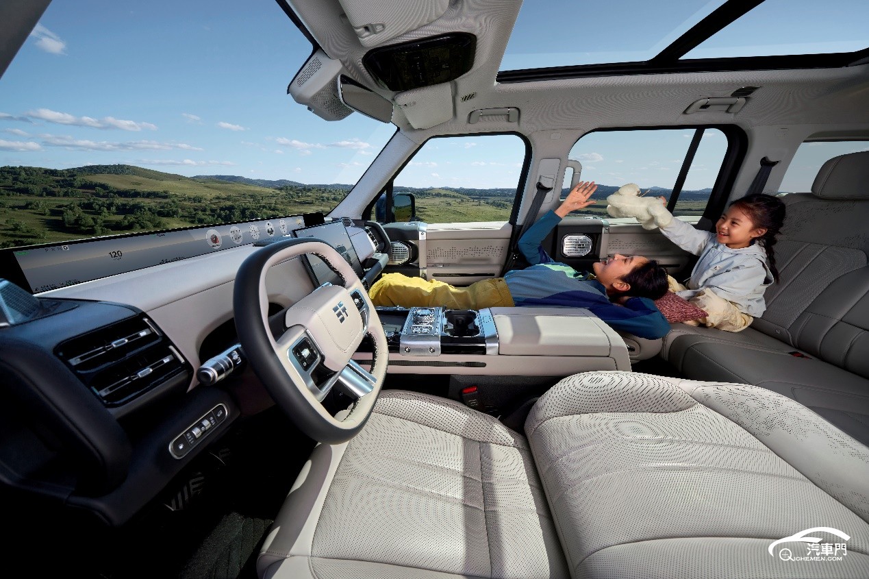 縱橫G700的內(nèi)飾設(shè)計得同樣非常硬朗。方正平直的儀表臺采用了分層設(shè)計,巨大的35.4英寸全液晶儀表屏橫跨儀表臺上,15.6英寸中控屏懸浮于儀表臺中央。儀表臺兩側(cè)配備了扶手,副駕手套箱處也配備了扶手。新車的換擋機構(gòu)采用了懷擋設(shè)計,副儀表臺操作區(qū)格外簡潔。另外,方形方向盤、副儀表臺、出風口、揚聲器和兩側(cè)門把手等處都加入了大面積鍍鉻裝飾,機械味道濃郁。