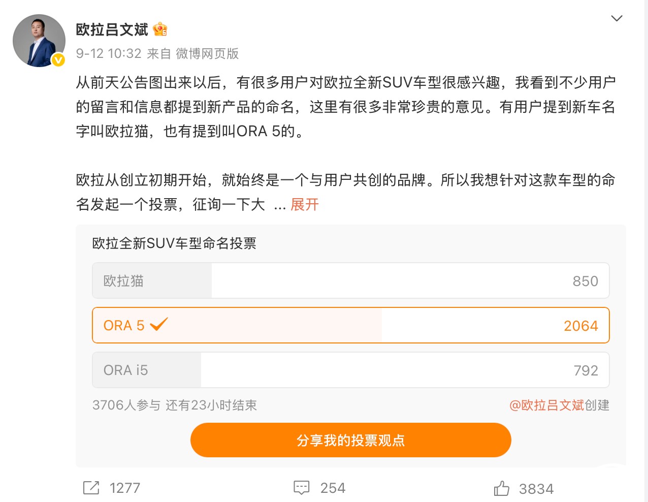 而隨著更多信息的露出,關(guān)于這臺(tái)全新SUV的命名也引發(fā)關(guān)注,歐拉品牌總經(jīng)理呂文斌更是在微博平臺(tái)發(fā)起投票征集。投票征集中“ORA 5”獲得了多數(shù)人的認(rèn)可,筆者也認(rèn)為這個(gè)名字更適合這臺(tái)全新SUV,不說(shuō)歐拉車(chē)型最初的命名方式就是簡(jiǎn)單英文字母+數(shù)字,目前很多征戰(zhàn)全球的車(chē)型也都以這樣的方式命名,簡(jiǎn)潔易記也契合歐拉全新SUV全球車(chē)型的身份。