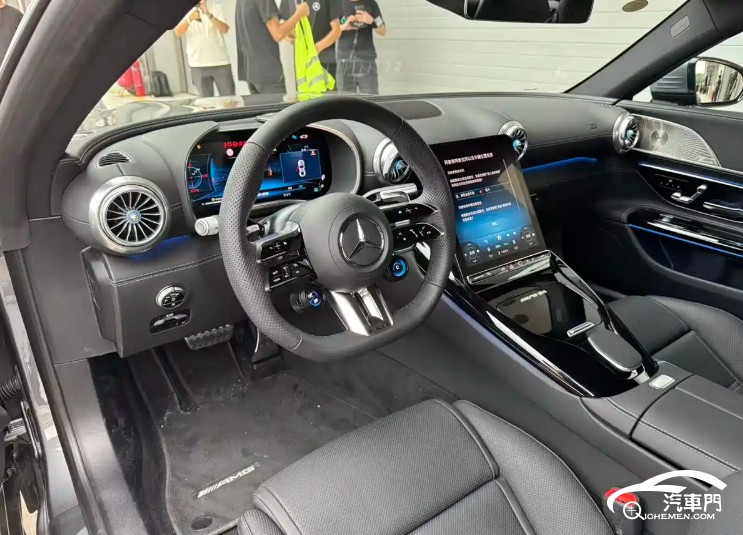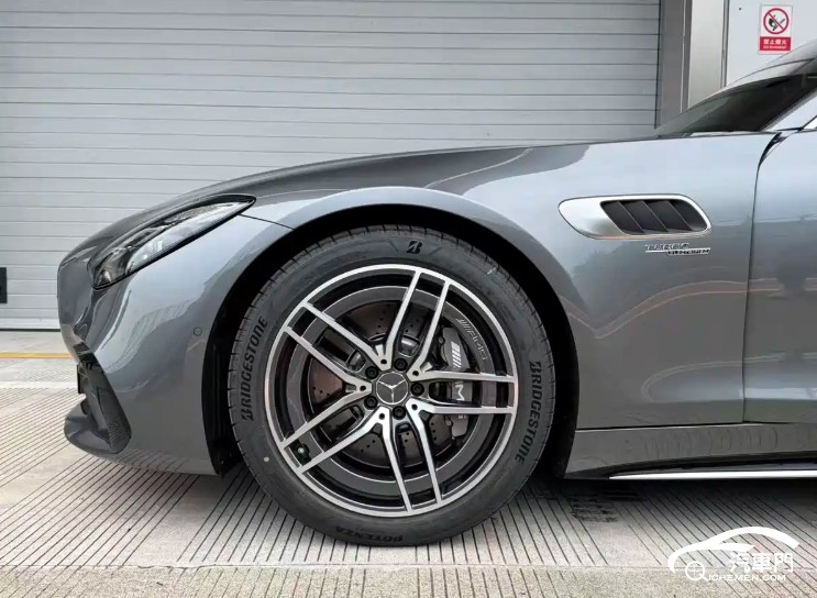 車身側(cè)面,新車采用了標準的長車頭短車身跑車設(shè)計,前后側(cè)翼子板呈現(xiàn)寬體造型,前翼子板上還配有鯊魚鰓散熱開口,車門上則配備隱藏式的車門把手。新車還采用了20英寸雙五輻式的環(huán)中環(huán)AMG樣式輪圈,并搭配銀色六活塞制動卡鉗和打孔剎車盤,并可選20英寸多輻AMG輕合金輪轂。在選裝AMG動態(tài)增強版組件后,還可選裝黑色或黃色制動卡鉗。
