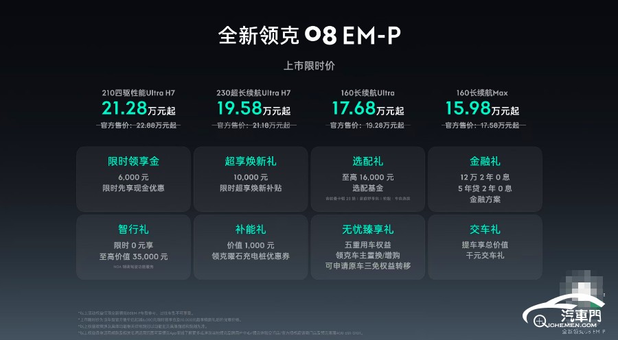9月24日,全新領克08 EM-P正式上市,推出160長續(xù)航Max、160長續(xù)航Ultra、230超長續(xù)航Ultra H7、210四驅性能Ultra H7共4款車型,限時售價區(qū)間15.98萬-21.28萬元。新車同步釋放八項限時權益,包括6000元限時先享現(xiàn)金優(yōu)惠、10000元超享煥新補貼、至高16000元選配基金,以及12萬2年0息/5年貸2年0息的金融方案;更有智行禮(0元享至高35000元NOA輔助駕駛服務)、補能禮(1000元充電樁優(yōu)惠券)、無憂臻享禮(五重用車權益+車主置換/增購權益轉移)與交車禮(千元提車禮包),以誠意權益降低購車門檻。同時,新車以設計、舒享、智駕、智能座艙、動力五大維度進階,為20萬級插混SUV市場樹立新標桿。