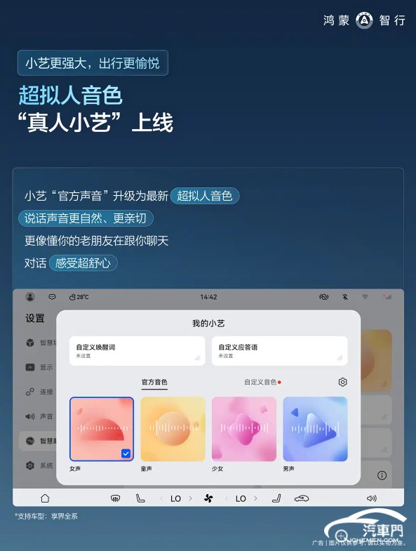同時(shí),超擬人音色”真人小藝“上線,小藝“官方聲音”升級(jí)為最新超擬人音色,說(shuō)話更自然、更親切。全新上線國(guó)慶、中秋新節(jié)日壁紙,節(jié)日氛圍感拉滿。部分車型新增天津、武漢、蘇州城市櫥窗燈語(yǔ)。此外,此次OTA還將提供更多功能升級(jí)優(yōu)化以及體驗(yàn)提升,詳情見上圖。