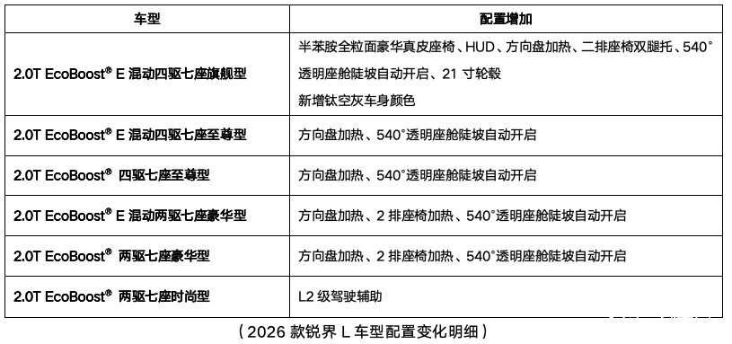 一直以來,福特銳界L不斷傾聽用戶真實用車需求,致力于為中國家庭提供更舒適的駕乘體驗。此次2026款福特銳界L上市煥新,帶來了豪華、舒適、安全和智能四大升級,主力車型,加配不加價。