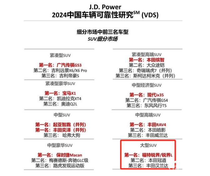 在2025年公布的J.D. Power 2024中國車輛可靠性研究SM(VDS)中,福特銳界L獲得大型SUV可靠性第一名。在車輛實際出行體驗上,第一批福特銳界L混動版車主有的行駛里程已超10萬公里,行車足跡遍布中國大陸所有省份的各種地形地貌,經(jīng)過10萬公里的考驗,福特銳界L各項功能正常穩(wěn)定工作,實測總行程平均百公里油耗7.66L、每公里油費不到5毛9。剎車片、火花塞等磨損微小,平均每萬公里保養(yǎng)費用不到360元,展現(xiàn)出福特銳界L的扎實制造水準和耐久性品質(zhì)。