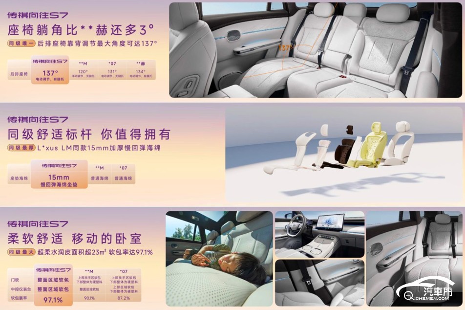 后排座椅堪稱“移動大沙發(fā)”,137°最大靠背角度比NASA標準多2°、比邁巴赫還多3°,搭配無級電調(diào)腿托與雷克薩斯同款15毫米加厚慢回彈海綿,久坐也無疲憊感。車內(nèi)超柔水潤皮包覆面積超23㎡,皮質(zhì)包覆比率超90%,車門、中控臺等細節(jié)處均采用軟質(zhì)材料;2.6㎡同級最大天幕玻璃則讓車內(nèi)通透敞亮,坐享晴空與星空。