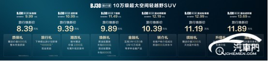 9月27日,BJ30旅行家正式上市,新車共有6款車型,官方指導價為9.99—13.69萬元,疊加國補和廠端置換后,購買價最低只需8.39萬元起。