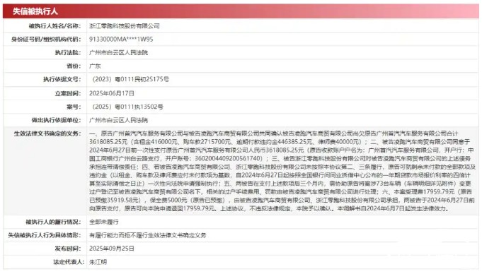 根據(jù)此前報(bào)道,9月25日,廣州市白云區(qū)人民法院將浙江零跑科技股份有限公司(零跑汽車,09863.HK)和其全資子公司凌跑汽車商貿(mào)有限公司(以下簡稱“凌跑汽車商貿(mào)”)列為失信被執(zhí)行人,案號(hào)為(2025)粵0111執(zhí)13502號(hào),執(zhí)行依據(jù)文號(hào)為(2023)粵0111民初25175號(hào)。