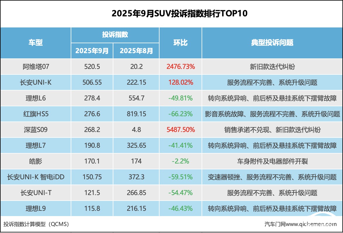 近日,汽車門網(wǎng)發(fā)布了2025年9月各項投訴指數(shù)。9月份,SUV整體投訴指數(shù)達到7622.65,環(huán)比下降5.17%,SUV投訴指數(shù)占比由上個月的56%下降至53%。其中長安汽車和理想汽車旗下多款熱銷車遭遇集中投訴,成為上榜車型的主要來源。阿維塔07是本月最大黑馬,投訴指數(shù)飆漲2476.73%,新舊款迭代糾紛成為投訴指數(shù)上漲的主要原因。長安汽車旗下三款車因服務(wù)流程不完善、系統(tǒng)升級問題登上投訴榜單,理想汽車旗下三款車因老生常談的轉(zhuǎn)向系統(tǒng)異響、前后橋及懸掛系統(tǒng)下擺臂故障的問題遭車主吐槽。