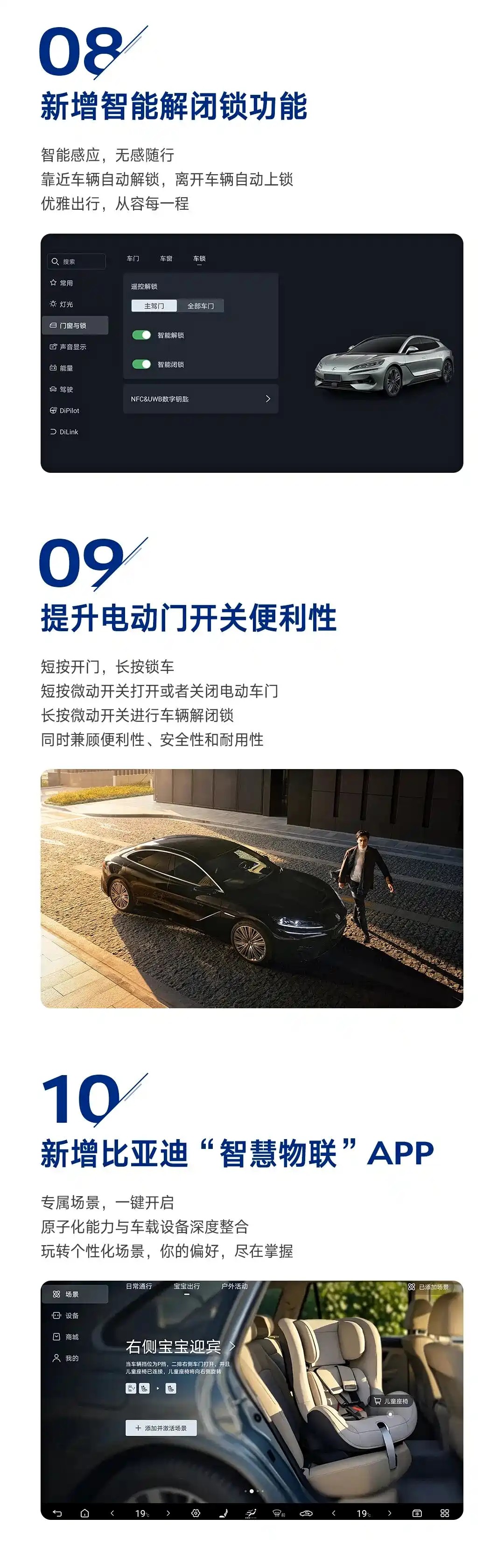此次更新還推出比亞迪“智慧物聯(lián)”APP,實現(xiàn)原子化能力與車載設(shè)備的深度整合,用戶可一鍵開啟日常通行、寶寶出行、戶外活動等專屬場景。以寶寶出行為例,當(dāng)車輛擋位為P擋、二排右側(cè)車門打開且兒童座椅已連接時,兒童座椅可自動向右側(cè)旋轉(zhuǎn),細(xì)節(jié)處提升使用便利性。此外,還優(yōu)化提升用車體驗,例如新增刷臉支付功能,通過DMS攝像頭完成人臉識別;小憩模式新增背景音及主題動效選擇;調(diào)整自動空氣循環(huán)策略(適用于騰勢Z9插混版、Z9GT插混版),用戶可自主設(shè)置隧道與駐車自動內(nèi)循環(huán);提升千里眼夜間查看車外實時視頻效果,改進(jìn)待機(jī)狀態(tài)減少冗余運行等。
