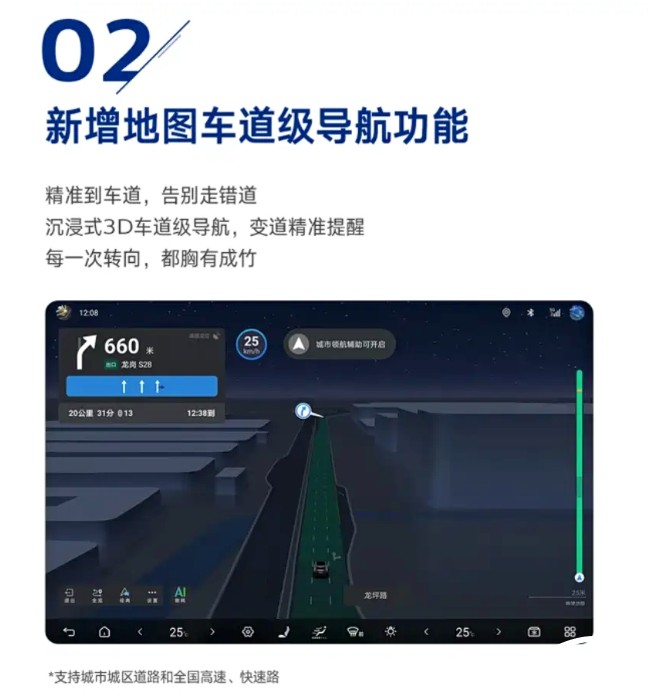 導(dǎo)航體驗(yàn)上,新車(chē)新增地圖車(chē)道級(jí)導(dǎo)航功能,覆蓋城市城區(qū)道路及全國(guó)高速、快速路,通過(guò)沉浸式3D車(chē)道級(jí)顯示與精準(zhǔn)變道提醒,有效避免“走錯(cuò)道”問(wèn)題,讓轉(zhuǎn)向決策更精準(zhǔn)。