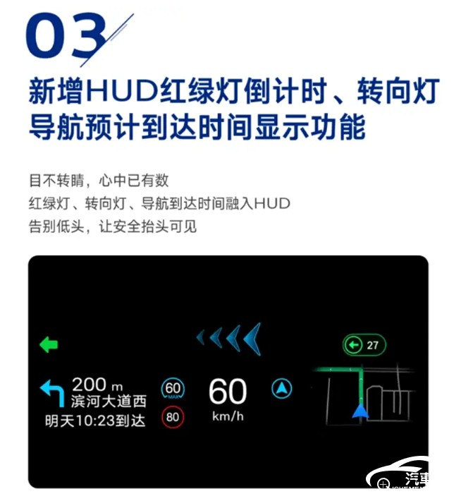 同時(shí),HUD(抬頭顯示)系統(tǒng)新增紅綠燈倒計(jì)時(shí)、轉(zhuǎn)向燈及導(dǎo)航預(yù)計(jì)到達(dá)時(shí)間顯示功能,將關(guān)鍵行車(chē)信息集成于駕駛視野范圍內(nèi),減少駕駛員低頭操作,提升行車(chē)安全性。