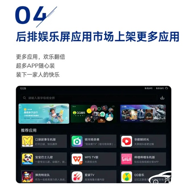 座艙娛樂(lè)與交互體驗(yàn)迎來(lái)多重優(yōu)化。后排娛樂(lè)屏應(yīng)用市場(chǎng)新增QQ音樂(lè)、銀河奇異果、嗶哩嗶哩車(chē)機(jī)版、寶寶巴士?jī)焊璧榷嗫預(yù)PP,滿足家庭出行中不同成員的娛樂(lè)需求。