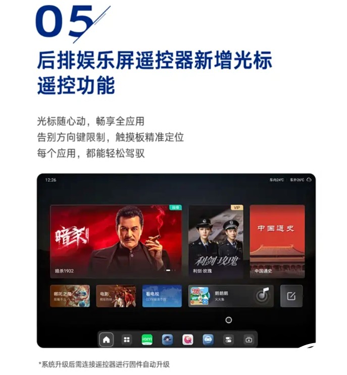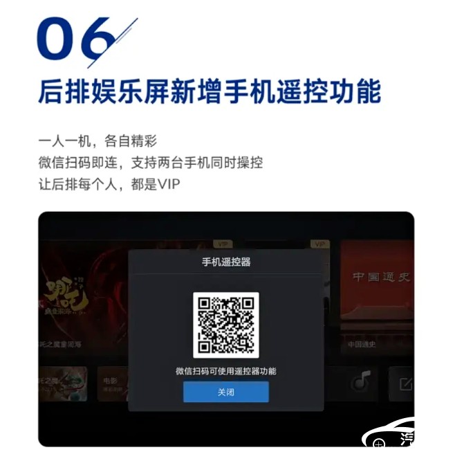 同時(shí),后排娛樂(lè)屏新增光標(biāo)遙控與手機(jī)遙控功能——光標(biāo)遙控支持觸摸板精準(zhǔn)定位,擺脫方向鍵操作限制,手機(jī)遙控則可通過(guò)微信掃碼連接,支持兩臺(tái)手機(jī)同時(shí)操控,讓后排乘客獲得更靈活的交互體驗(yàn)。