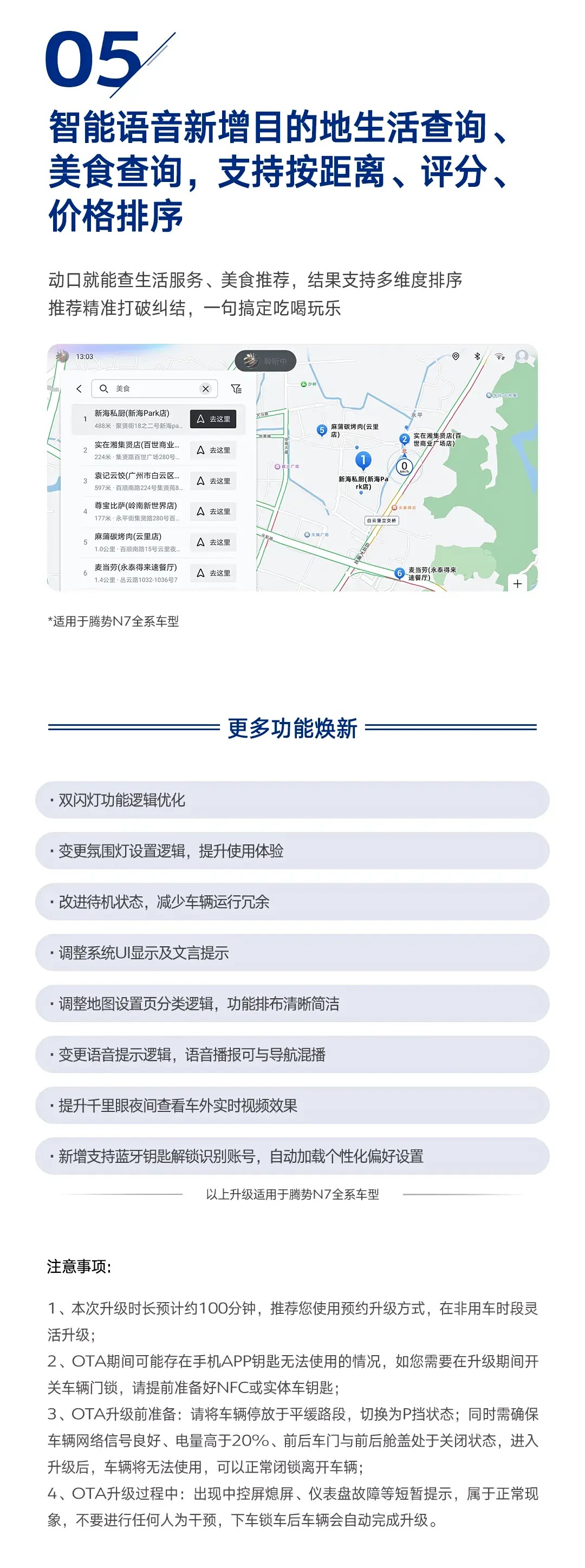 智能語音新增目的地生活查詢、美食排序的篩選功能,用戶可以根據(jù)距離、評(píng)分、價(jià)格進(jìn)行排序篩選,更加精準(zhǔn)地找到符合所需的目的地。其它部分主要是通過更新軟件邏輯、UI設(shè)計(jì)等來給予用戶更為效率的用車體驗(yàn),此次升級(jí)涉及騰勢N7全部車型,升級(jí)時(shí)間需要100分鐘,請(qǐng)大家合理規(guī)劃OTA升級(jí)時(shí)間。