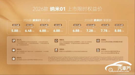納米01特別推出「初心款」與「摯愛(ài)款」雙版本共計(jì)8款車(chē)型,限時(shí)煥新指導(dǎo)價(jià)5.88-8.88萬(wàn)元,并且為用戶(hù)準(zhǔn)備了安心禮、金融禮、精品禮、繽紛禮等七重大禮。
