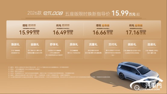 2026款eπ008五座版提供增程、純電兩種動(dòng)力,超闊版、超尊版兩種配置,共計(jì)四款產(chǎn)品,限時(shí)煥新指導(dǎo)價(jià)15.99-17.16萬(wàn)元,還可享受包含金融禮、質(zhì)保禮、交付禮、選裝禮、流量禮等多重上市權(quán)益。