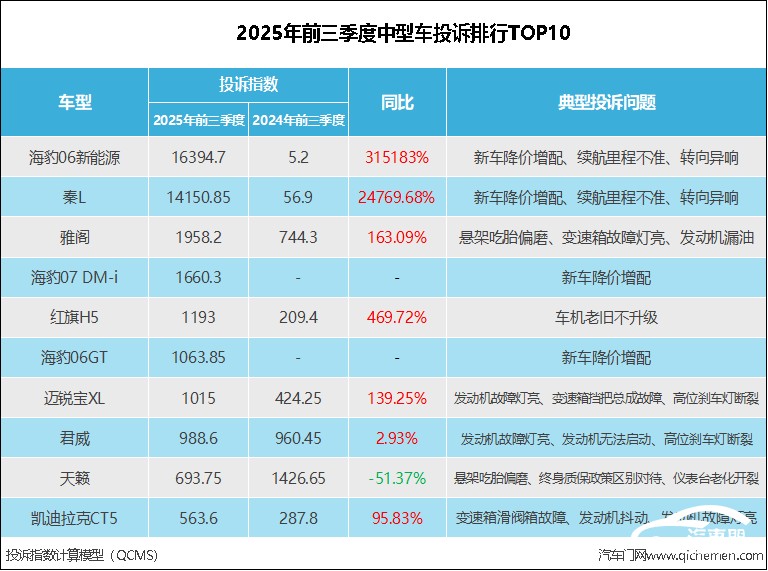 霸榜2025年前三季度中型車投訴指數(shù)排行:兩姊妹車強(qiáng)勢