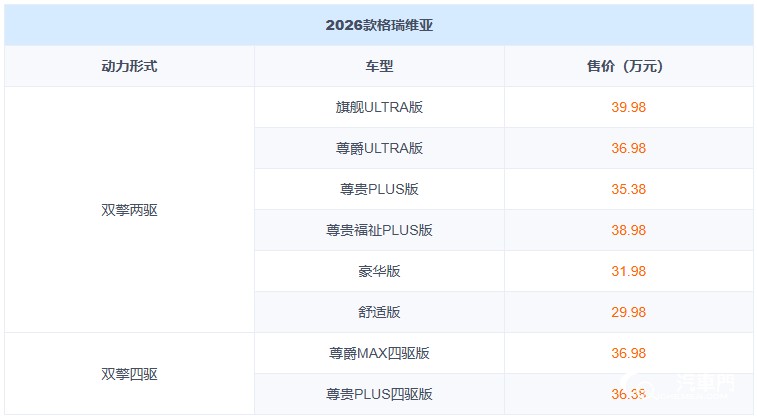 10月18日,我們從一汽豐田官方了解到,旗下中大型MPV——2026款格瑞維亞正式上市,共推出8款配置車型,售價(jià)區(qū)間為29.98-39.98萬元。此次改款增加尊爵MAX四驅(qū)版配置車型,關(guān)于新車詳細(xì)售價(jià),請(qǐng)見下表: