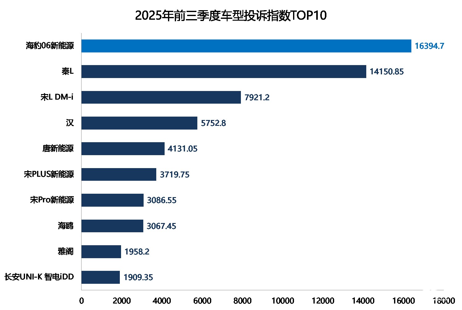 比亞迪整體投訴指數(shù)的“鶴立雞群”也體現(xiàn)在了車型投訴榜上。榜單TOP10中,比亞迪包攬了前八,年初比亞迪推出智駕版引發(fā)了比亞迪多款車型老車主的不滿。如潮的降價(jià)增配投訴聲背后,比亞迪多款車型的其他問題也遭到了部分車主的集中投訴。海豹06新能源、秦L、漢續(xù)航里程不準(zhǔn),唐新能源、宋PLUS新能源和宋Pro新能源發(fā)動(dòng)機(jī)異常啟動(dòng)和配置與官宣不符等問題都成了車主的投訴對象。