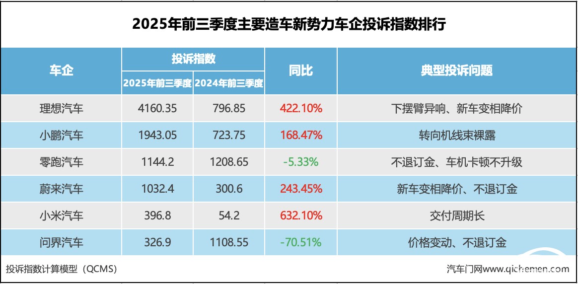今年前三季度主要造車新勢力的投訴指數(shù)正式出爐。