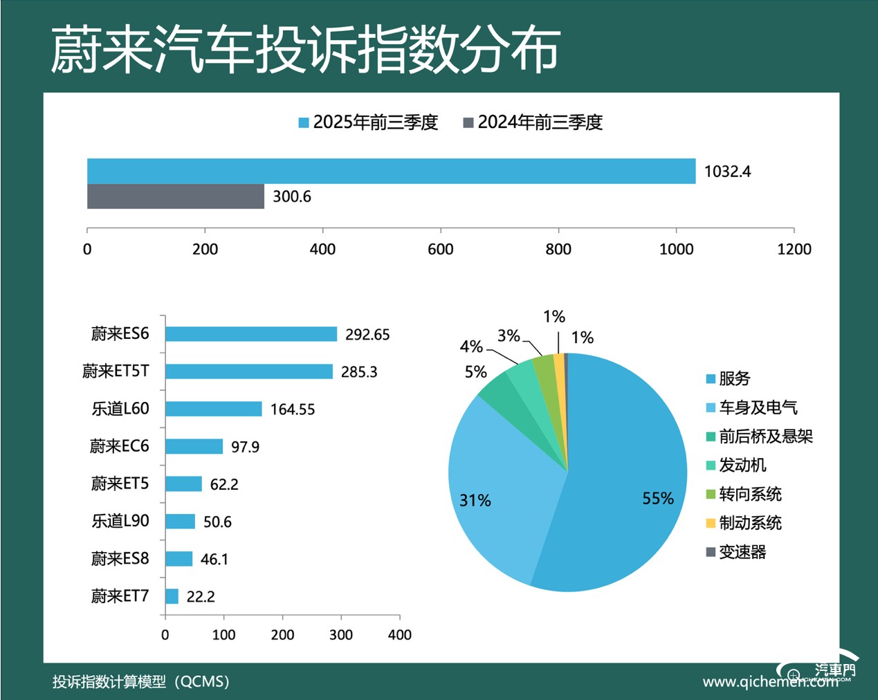 汽車質(zhì)量投訴點評:蔚來汽車今年前三季度的投訴指數(shù)為1032.4,新車變相降價、不退訂金成為蔚來汽車收到投訴的主要原因。今年蔚來汽車官方宣布,于今年8月19日起,蔚來汽車的蔚來100kWh長續(xù)航電池包價格從12.8萬元下調(diào)至10.8萬元,選擇整車購買100kWh長續(xù)航電池包的全系新車價格也會同步調(diào)整。這代表用戶不再需要額外花錢升級蔚來電池包,相當于變相降價3.8萬元。蔚來汽車短時間內(nèi)的降價增配遭到大量老款車車主的集體投訴。雖然蔚來汽車官方針對2025年1月1日至8月28日完成交付的蔚來ET5、蔚來ET5T、蔚來ES6、蔚來EC6、蔚來ET7、蔚來ES7、蔚來EC7和蔚來ES8老用戶補償發(fā)放價值6000元煥新禮金券,可用于增換購蔚來品牌全系新車時直接抵減車價。但不少蔚來汽車老車主并不滿意蔚來汽車的補償措施。