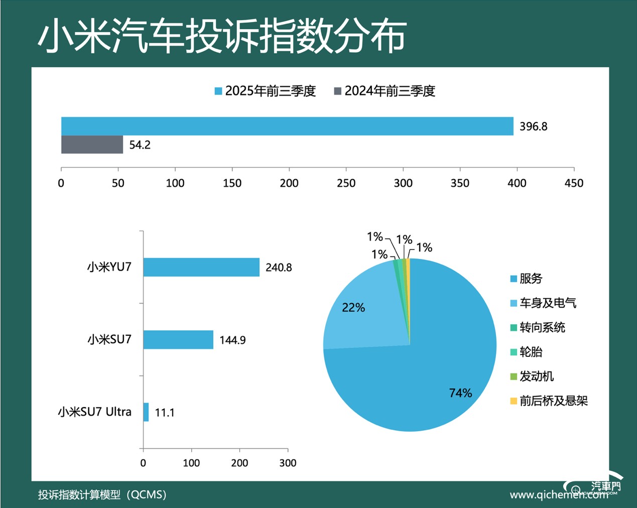 汽車質(zhì)量投訴點評:今年前9個月小米汽車的投訴指數(shù)為396.8,同比激增632.1%,小米汽車收到集中投訴的主要原因是交付周期長。該投訴集中體現(xiàn)在小米YU7車型中。網(wǎng)絡各平臺關于小米汽車交付周期長的討論屢見不鮮。不少小米YU7車主投訴稱,小米汽車官方并未標明小米YU7提車周期,在訂購該車鎖單后交付時間長。還有該車車主反饋,下單時小米汽車官方系統(tǒng)存在BUG,發(fā)生自動鎖單、鎖單慢、信息異常等問題。很多車主紛紛投訴,要求小米汽車官網(wǎng)盡快處理問題,希望為其退訂或盡快交車。