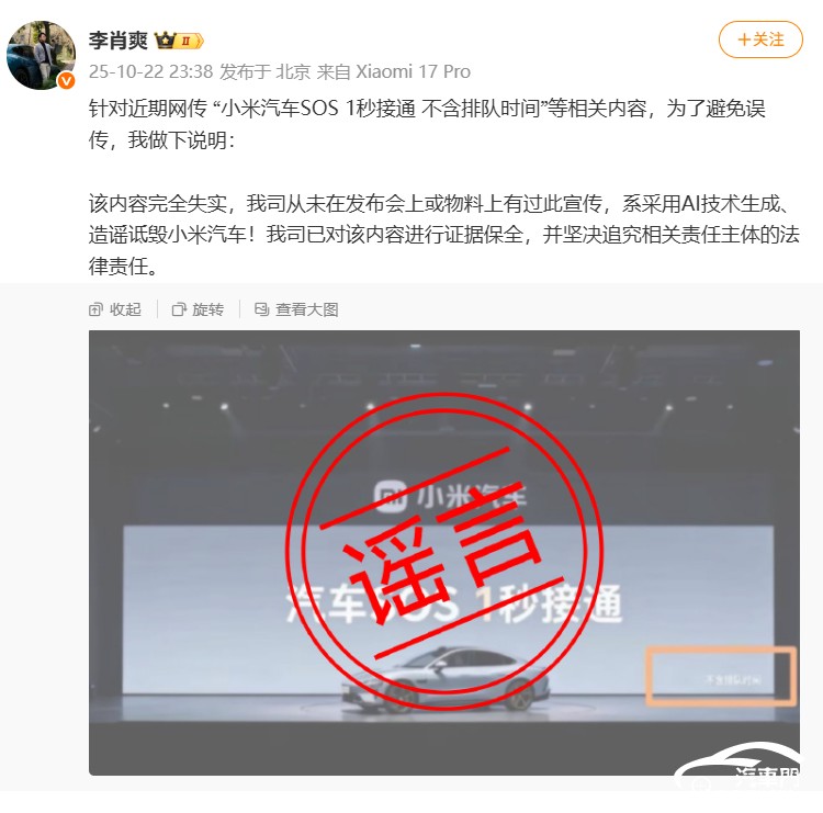 據(jù)他發(fā)布的圖片來看,謠言是一張PPT照片,大字顯示“汽車SOS 1秒接通”,右下角則顯示小字“不含排隊時間”。李肖爽表示:“該內(nèi)容完全失實,我司從未在發(fā)布會上或物料上有過此宣傳,系采用AI技術生成、造謠詆毀小米汽車!我司已對該內(nèi)容進行證據(jù)保全,并堅決追究相關責任主體的法律責任?!?/p>
