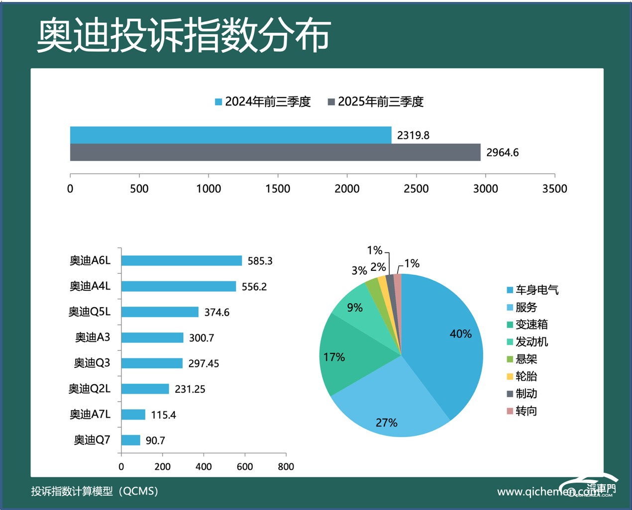 汽車(chē)質(zhì)量投訴點(diǎn)評(píng):奧迪今年前9個(gè)月的投訴指數(shù)小幅上升,同比上升了近三成。車(chē)身裝飾脫落和變速箱機(jī)電單元故障成為奧迪遭到集中投訴的主要原因。奧迪Q2L是車(chē)身裝飾脫落的主要車(chē)型。大量該車(chē)車(chē)主投訴稱(chēng),奧迪Q2L在行駛過(guò)程中C柱飾板掉落,存在較大安全隱患。奧迪車(chē)主紛紛訴求奧迪廠(chǎng)家為其免費(fèi)維修并加固。