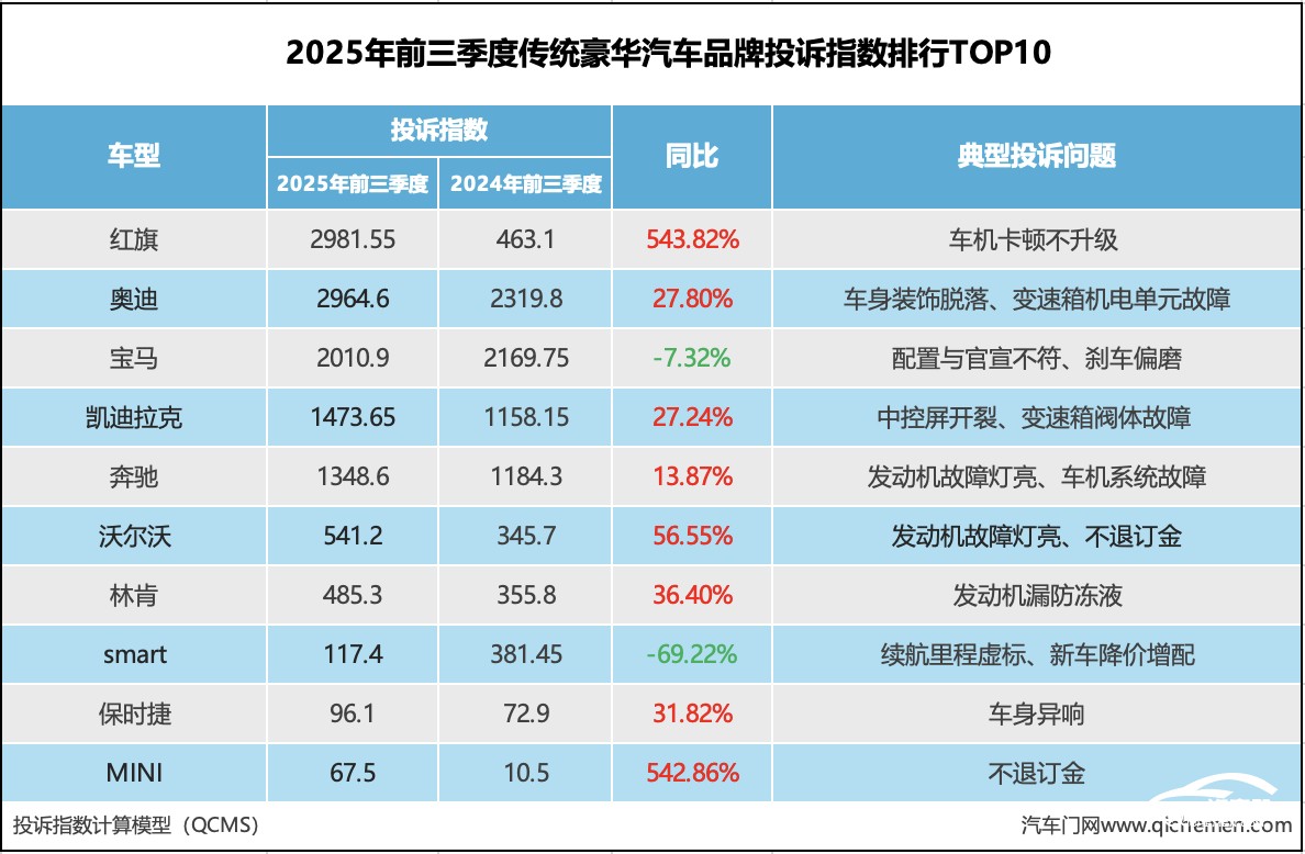 2025年前三季度傳統(tǒng)豪華汽車(chē)品牌投訴指數(shù)排行:某品牌超BBA