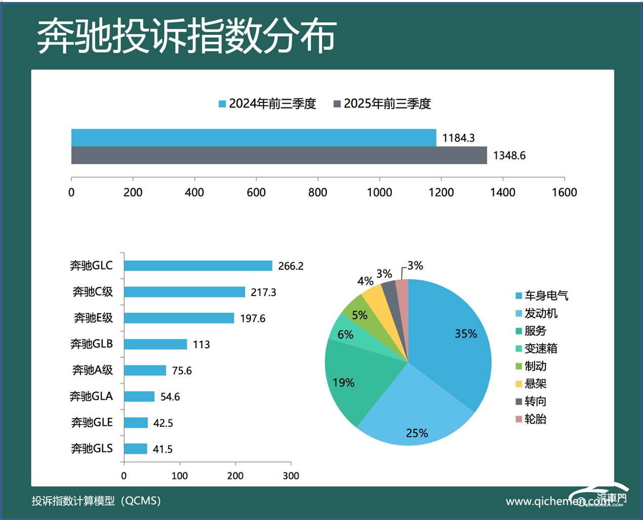 汽車(chē)質(zhì)量投訴點(diǎn)評(píng):今年前9個(gè)月奔馳的投訴指數(shù)為1348.6,同比上升一成多,上漲幅度較小。從投訴反饋看,奔馳的主要“槽點(diǎn)”集中在奔馳GLC、奔馳C級(jí)和奔馳E級(jí)三大車(chē)型中,發(fā)動(dòng)機(jī)故障燈亮和車(chē)機(jī)系統(tǒng)故障是奔馳的兩大頑疾。