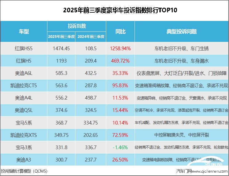 榜單TOP10中,紅旗HS5和紅旗H5兩車因車機(jī)老舊不升級問題遭到車主集中投訴,投訴指數(shù)呈翻倍式增長。凱迪拉克CT5位列榜單第四名,因變速箱滑閥箱故障、經(jīng)銷商不退訂金、承諾不兌現(xiàn)等問題引起車主不滿。凱迪拉克XTS投訴指數(shù)同比上漲72.59%,中控屏觸摸失靈且開裂是其典型投訴問題。其余車型均屬于德系車型,奧迪占據(jù)4個席位,寶馬占據(jù)1個席位。其中,寶馬3系是榜單中投訴指數(shù)唯一同比下滑的車型,經(jīng)銷商不退訂金、發(fā)動機(jī)漏防凍液、承諾不兌現(xiàn)等問題聲量均有所降低。