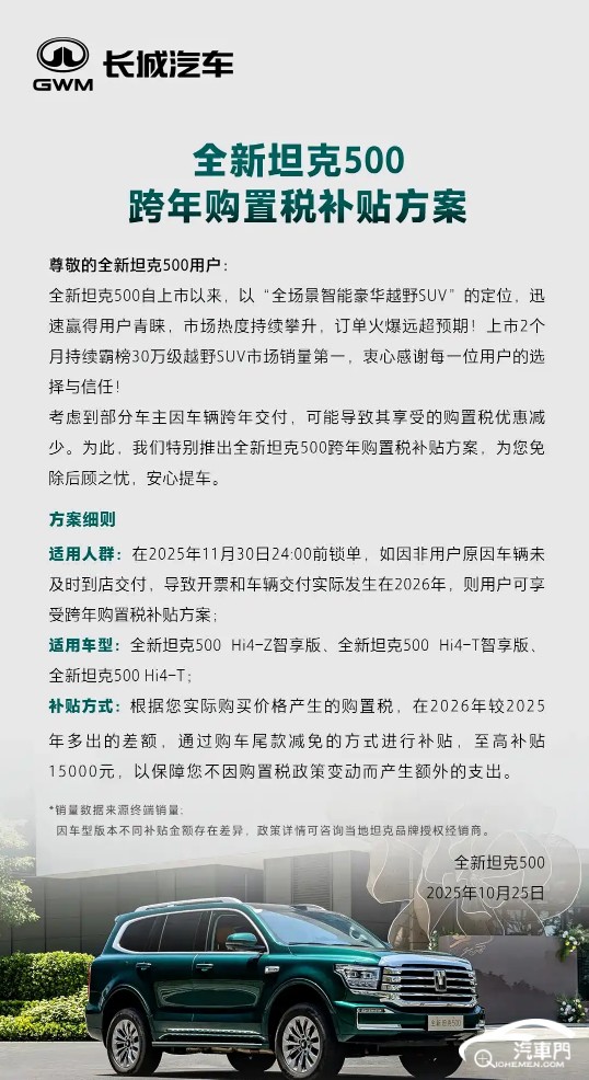 坦克500推出跨年購置稅補(bǔ)貼方案