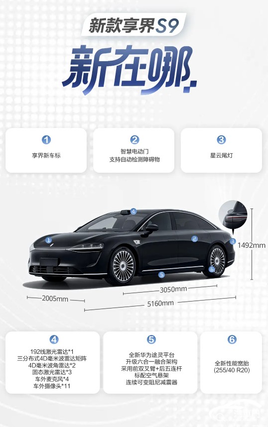 10月27日,我們從享界品牌獲取到了旗下中大型轎車——新款享界S9官圖。該車將針對外觀進(jìn)行調(diào)整,并搭載新車標(biāo)、全新星云尾燈、全新輪圈樣式、星河大燈,支持選配智慧電動門、智能電子外后視鏡、華為百萬像素智慧大燈等。同時,該車還將搭載36個高精度傳感器,標(biāo)配四激光雷達(dá),前向升級3分布式毫米波雷達(dá)矩陣,并新增車外麥克風(fēng)。動力形式方面,將繼續(xù)提供純電和增程兩種形式,并將在11月完成上市。