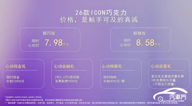 10月28日,吉利ICON巧克力心動紫正式上市,新車指導價8.98-9.58萬元,限時心動價7.98-8.58萬元。心動紫限時免費選裝。即日起至11月30日前購車的用戶,除了可以享受10000萬的心動現(xiàn)金禮,還可享受心動煥新禮、心動金融禮及心動流量禮。包括4000元換購補貼、2年5.5萬0息貸款,至高貼息5500元、首任車主基礎流量免費,3年免費娛樂流量(不限流不限量)。新車定位為一款小型SUV,此次上市車型為新增車漆色車型。