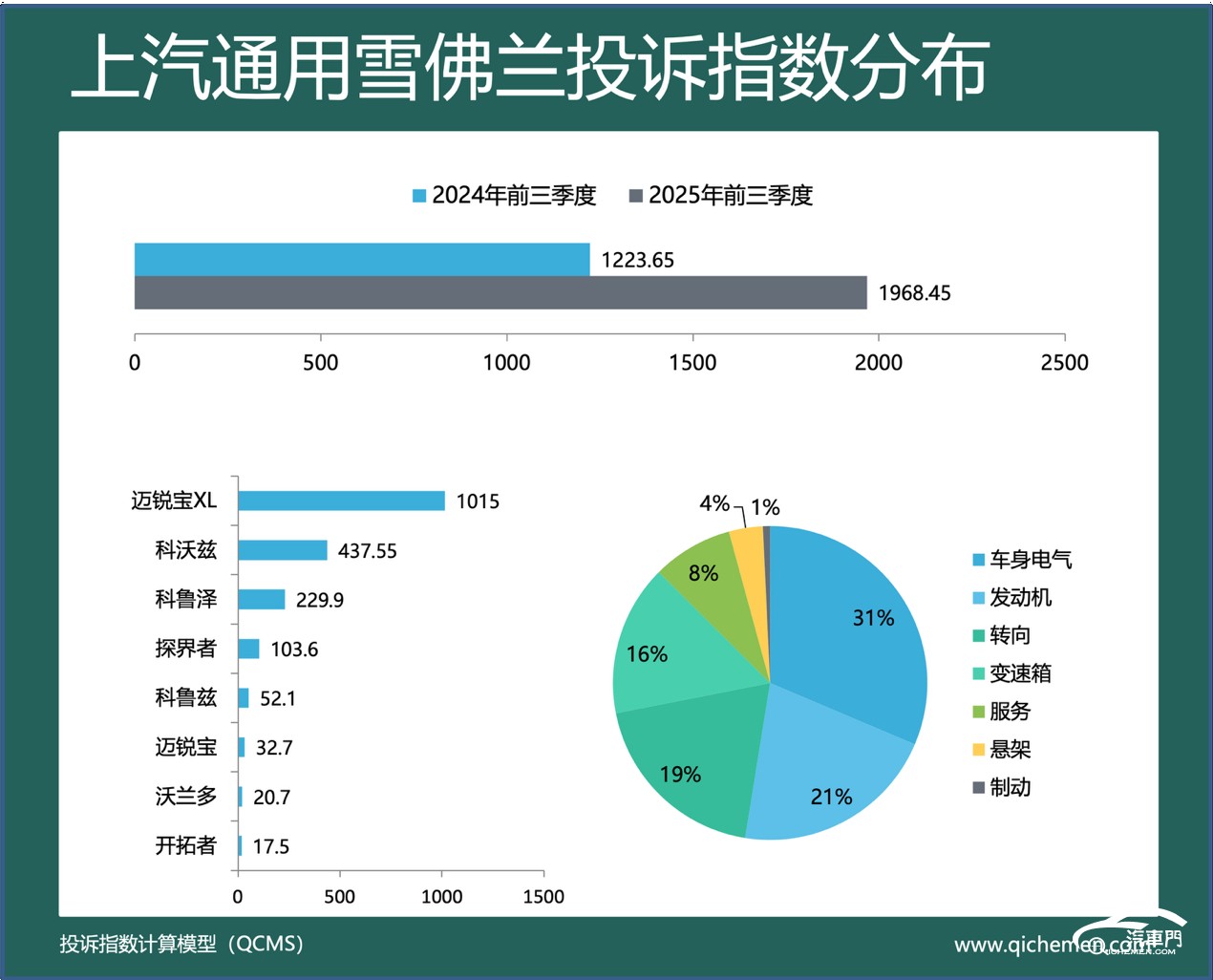 汽車(chē)質(zhì)量投訴點(diǎn)評(píng):上汽通用雪佛蘭今年前三季度的投訴指數(shù)為1968.45,同比上漲六成多。變速箱擋把故障和剎車(chē)燈開(kāi)裂是該車(chē)收到大量投訴的典型問(wèn)題。雪佛蘭投訴的車(chē)款同樣以2019年前的老款車(chē)為主。邁銳寶XL和科沃茲車(chē)型的投訴頻發(fā)。據(jù)悉,大量邁銳寶XL頻頻投訴該車(chē)的變速箱P檔無(wú)法掛入,部分車(chē)主稱(chēng)掛上P擋儀表也不顯示。此外,邁銳寶XL車(chē)主還深受該車(chē)的高位剎車(chē)燈開(kāi)裂困擾。