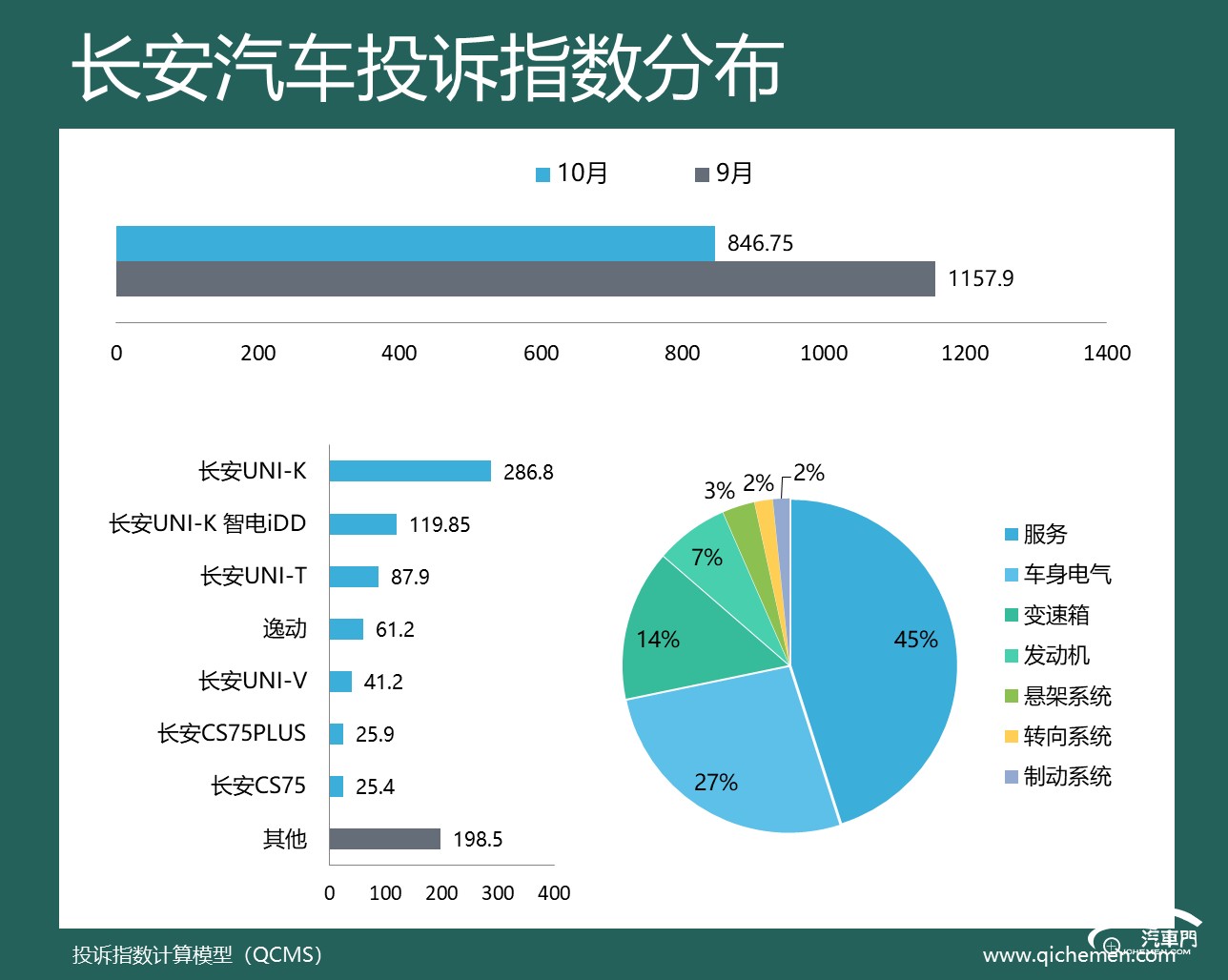 汽車質(zhì)量投訴點(diǎn)評:與比亞迪一樣,近幾個月來因車機(jī)不升級而遭到“圍攻”的長安汽車投訴指數(shù)也在逐漸歸于平靜。10月,長安汽車的投訴指數(shù)大幅下降了26.87%,是榜單TOP10投訴指數(shù)下降幅度最大的車企之一。當(dāng)然,長安汽車的投訴問題仍然比較集中,車機(jī)卡頓不升級和變速箱頓挫異響仍是車主們主要吐槽對象。這背后,長安UNI-K系列“功不可沒”。