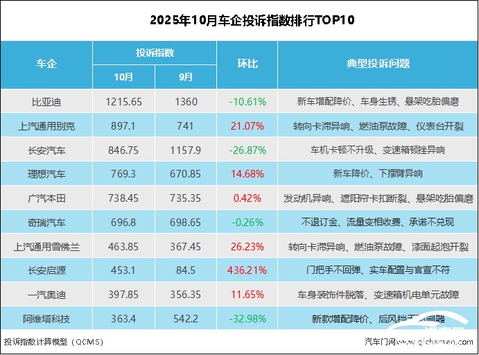 2025年10月車企投訴指數(shù)排行:降價又引發(fā)集中吐槽