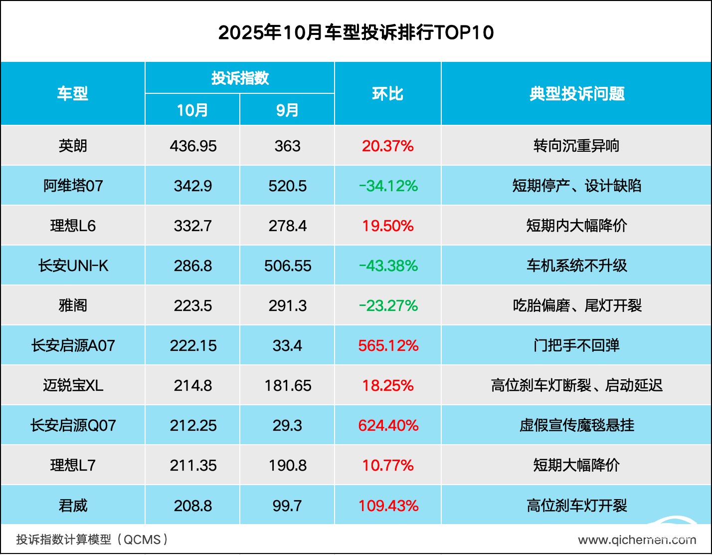 近日,汽車門網(wǎng)發(fā)布2025年10月車型投訴指數(shù)榜單。隨著汽車市場競爭的加劇,不少車企開始通過加快新車更新頻率和推出各種優(yōu)惠補貼,提升產(chǎn)品的競爭力,但這也引發(fā)了一系列問題。例如新車的短期換代和增配降價讓老車主憤怒不已,阿維塔07、理想L6、理想L7均因該問題上榜。除此之外,產(chǎn)品通病仍是榜單中的投訴主流,英朗、長安UNI-K、雅閣、邁銳寶XL就因為這樣那樣的質(zhì)量頑疾成為投訴榜單的???。